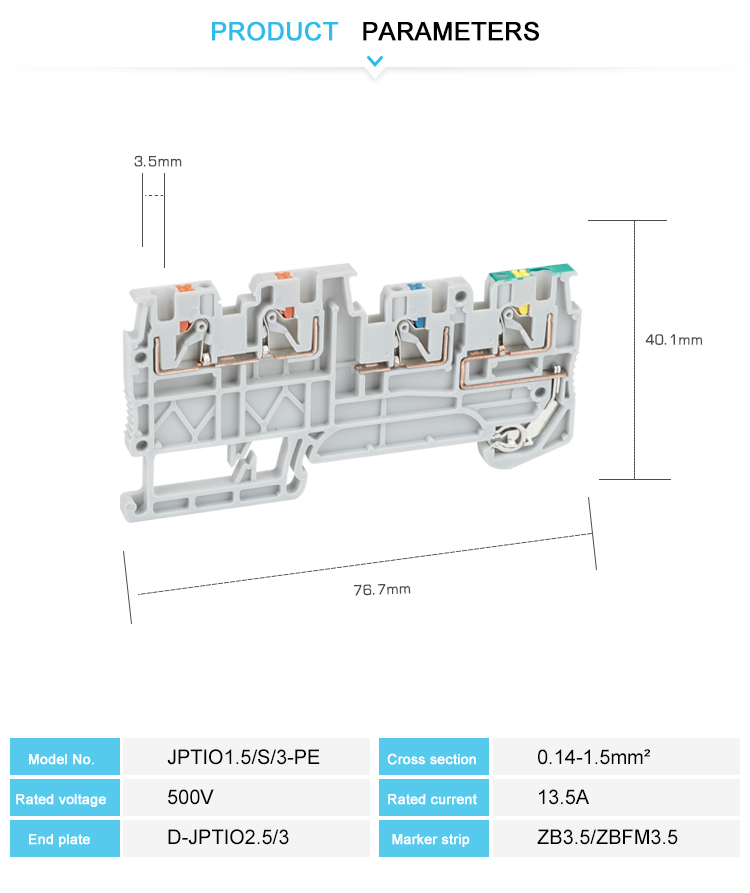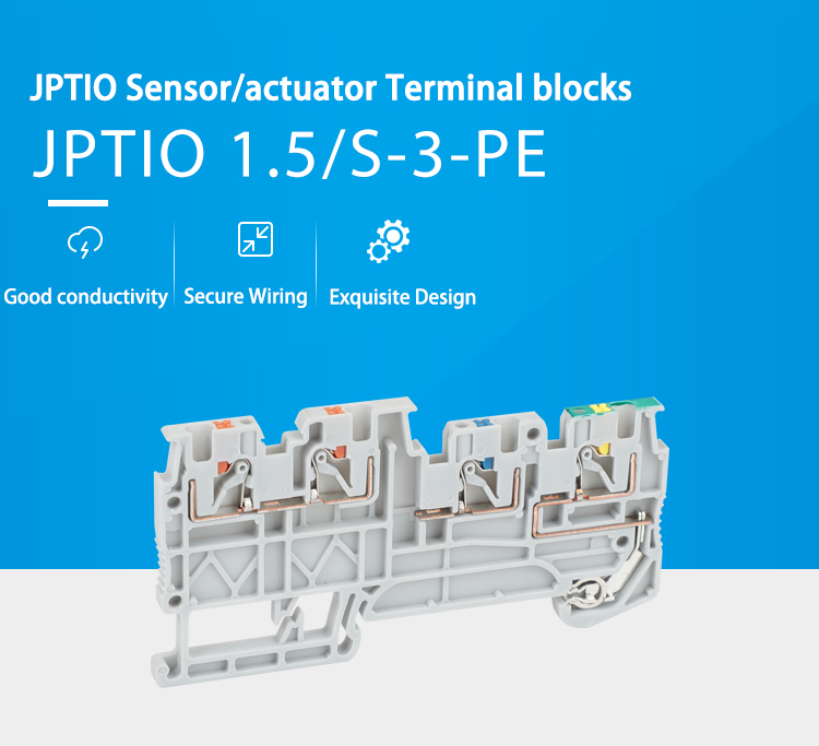 JPTIO1.5/S/3-PE terminal bloğu terminal bloğu, zorlu çalışma koşulları altında elektriksel güvenliği ve mekanik gücü sağlamak için alev geciktirici naylon PA66, pirinç iletken ve paslanmaz çelik sıkıştırma yayını kullanır.