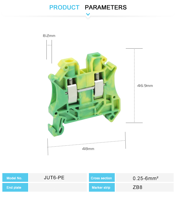 UT6-PE yüksek performanslı topraklama terminal bloğu, endüstri ve ticarette güvenilir topraklama için özel olarak tasarlanmıştır ve DIN raylarıyla kurulumu kolaydır. Vida bağlantısı, sabit/bükülmüş bakır tellerle uyumlu, anti-vibrasyon ve hava geçirmezdir. Yüksek kaliteli alev geciktirici malzemeler, endüstri standartlarını karşılayan ısıya dayanıklı ve darbeye dayanıklıdır. Verimli ve dayanıklı topraklama çözümleri sağlayan kontrol dolapları ve güç dağıtım sistemleri gibi sert senaryolar için uygundur.